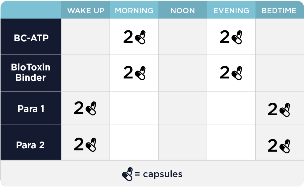 Individuals will continue to take BC-ATP and BioToxin Binder to promote ATP production, a balanced gut microbiome, and the body’s natural ability to detoxify.*