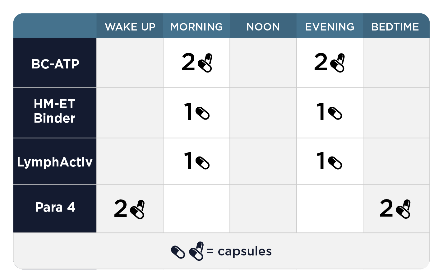 If an individual experiences excess reactions, we recommend introducing one supplement at a time (and starting with a half dose) in the order listed on the dosing chart.